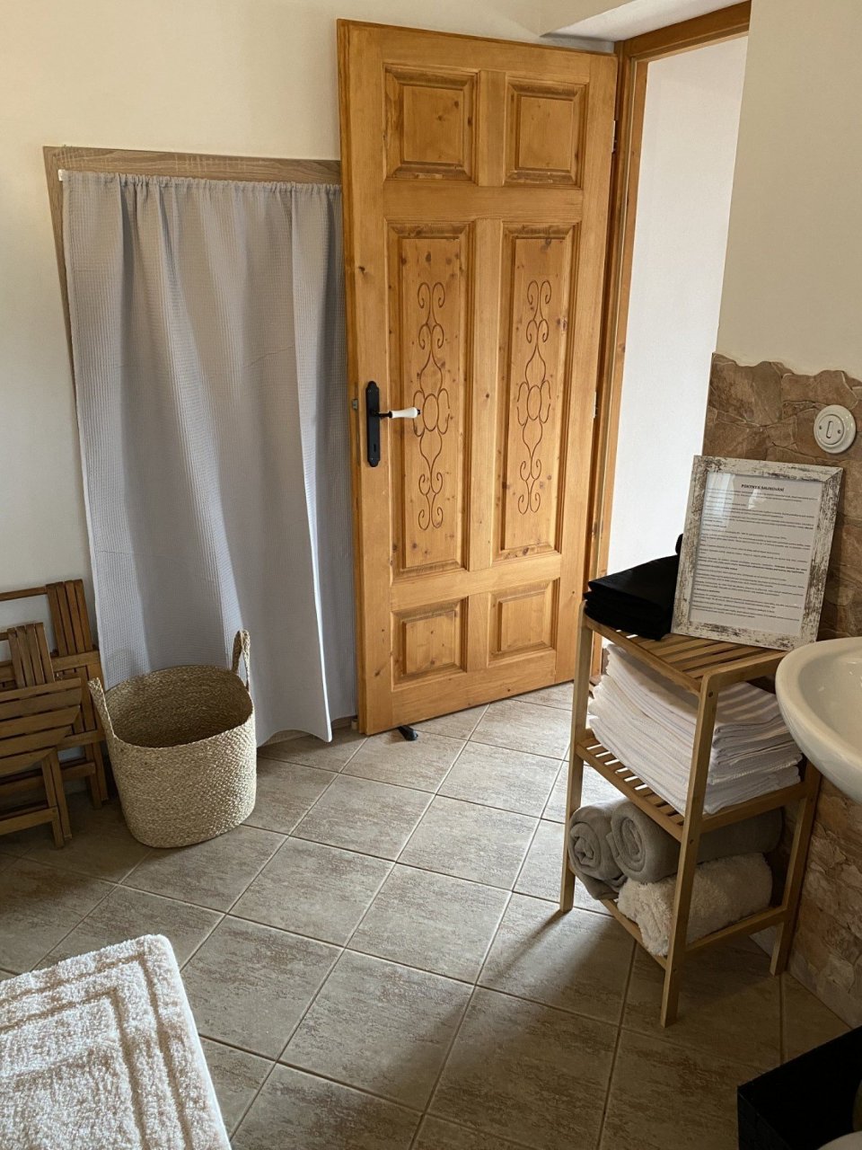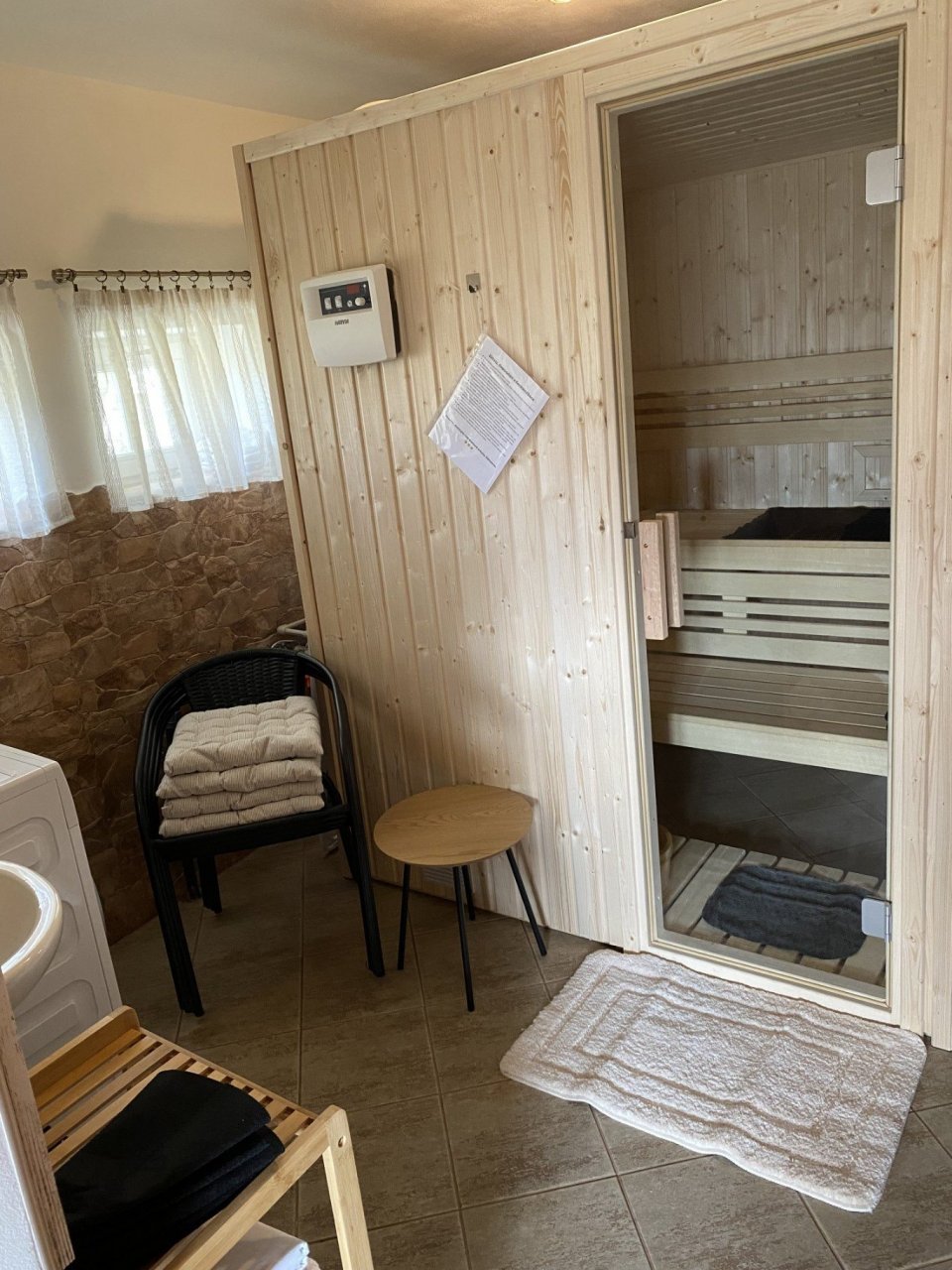 Sauna Naše finská sauna je pro 2-3 osoby. Je umístěna v místnosti s technickým zázemím v přízemí hned vedle koupelny.